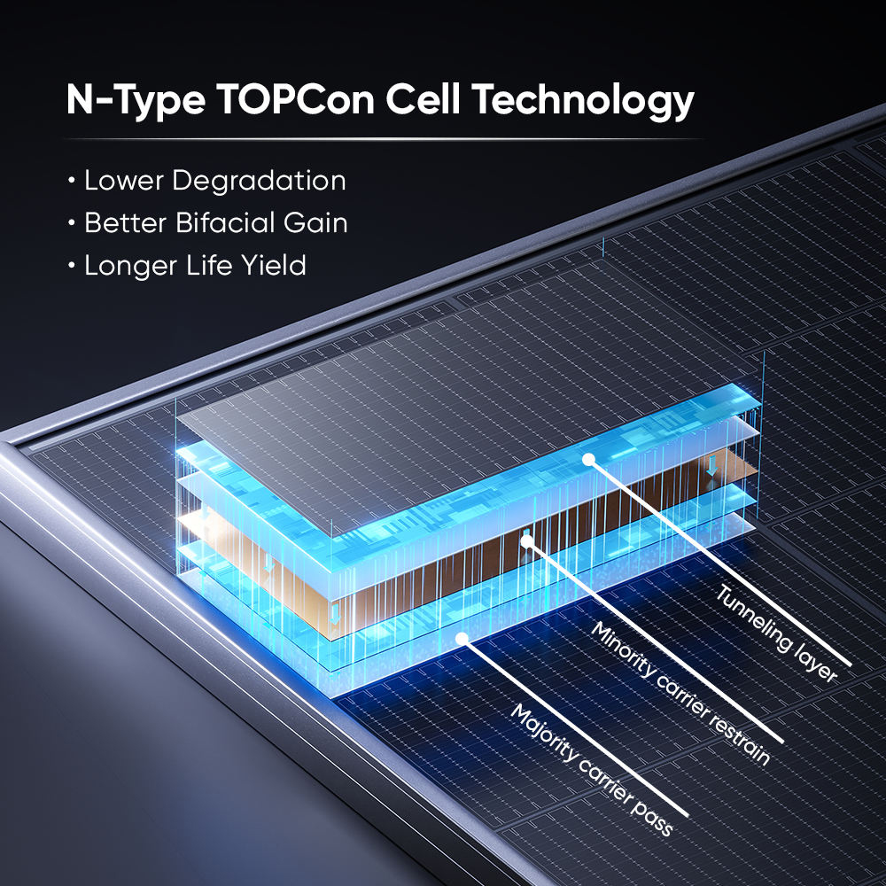 N type TOPCon (Tunnel Oxide Passivating Contacts) technology offers several benefits over traditional P-type modules, including higher efficiency, better low-light performance, and lower LID (Light Induced Degradation) and LeTID (Light and elevated Temperature Induced Degradation). This ensures more stable power output over the module's 30-year lifespan.